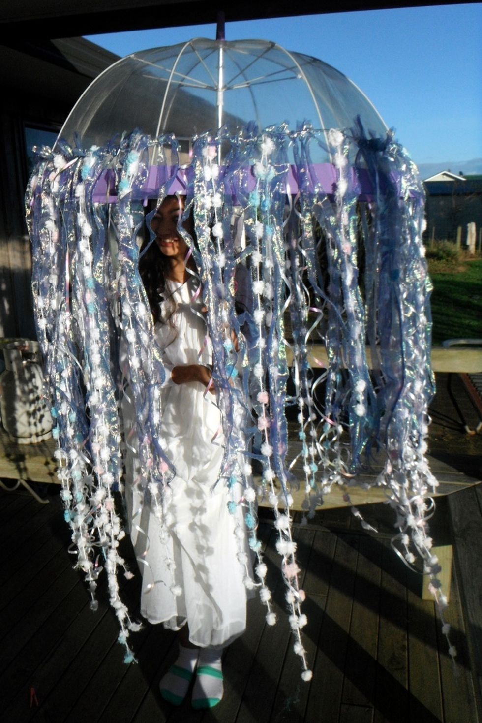 This one is unique and easy to accomplish. For this one, you can wear whatever you want. The magic is in the umbrella. Grab a clear umbrella and attach twirly ribbon, glow sticks and clear stringed jewels.