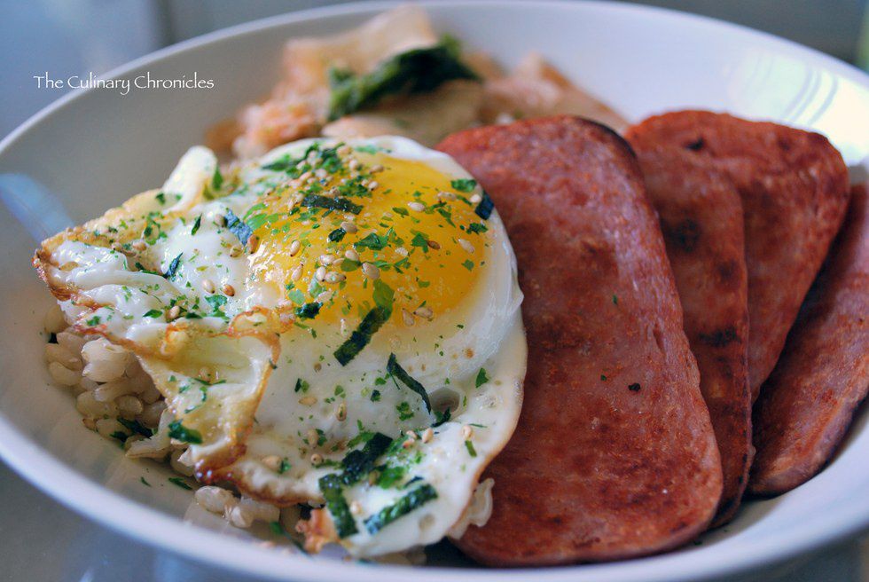 Rice is a staple with every meal -- breakfast, lunch, and dinner. Also, spam is a legit food in Hawai'i and is used to create delicious foods such as fried rice, musubi, and spam and eggs.