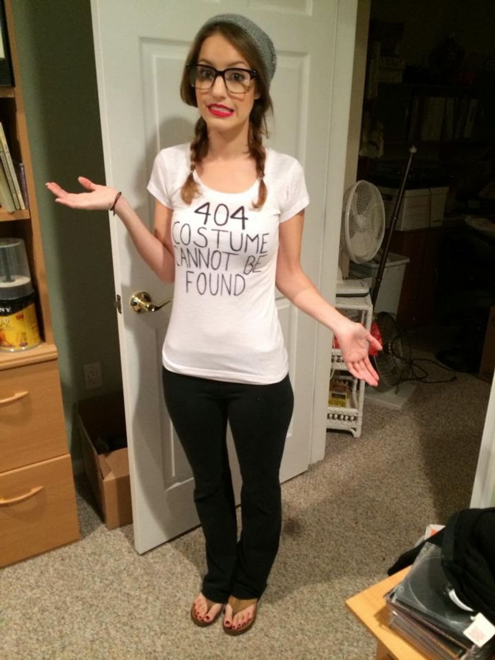 Going to a last minute Halloween party? Throw this costume together in less than five minutes. Get an old white t-shirt and a sharpie. Then write "Error 404: Costume Not Found" on the shirt. You are now a computer error. Perfect.