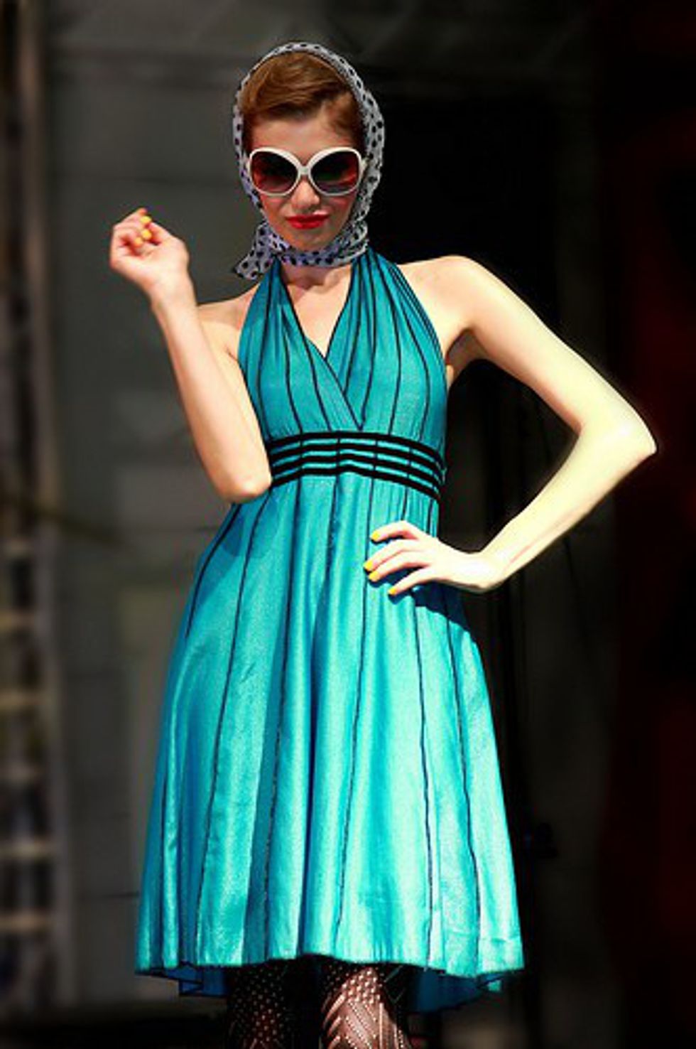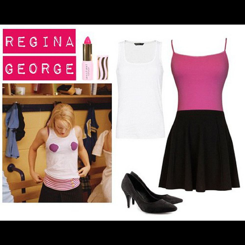 Take an old tank top and cut out holes in the chest, layer it over another tank top, then wear a skirt and low heels.