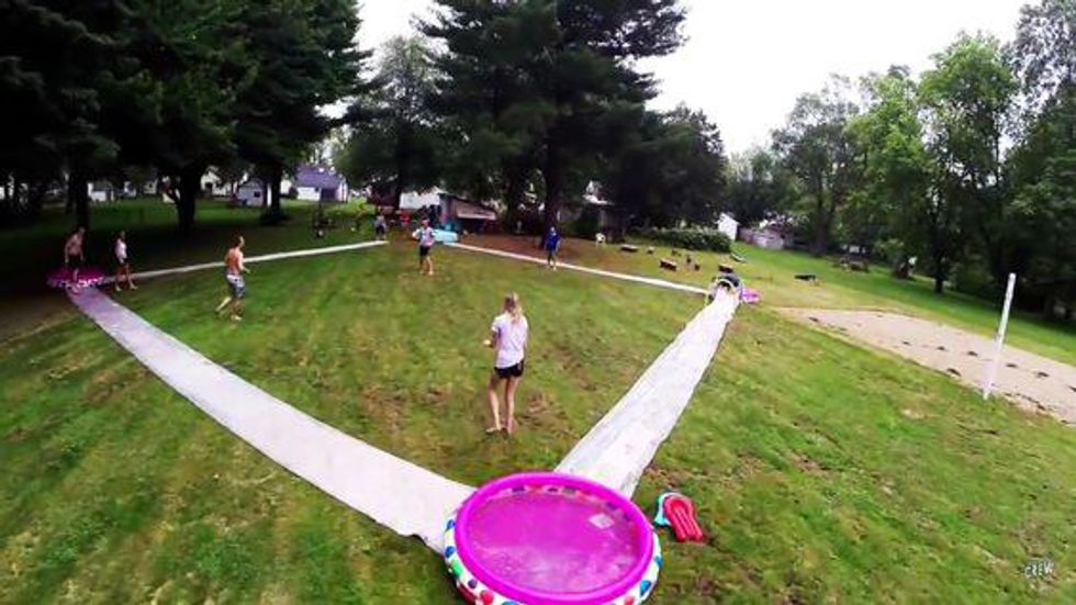 Connect four slip-and-slide runways with miniature inflatable pools, and add some soap and water, for an extreme game of kickball.