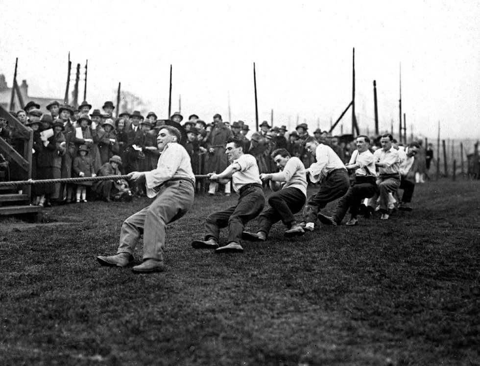 Tug of War was an event during the Ancient Olympics, and ran as event in the modern Olympics until 1920. The event consisted of two teams of eight, and in order to win, one team had to pull the other six feet forward. If both teams are unable to do this within five minutes, the team that pulled the most is declared the winner. During the 1920 Summer Olympics in Antwerp, Belgium, the final round of Tug of War was played. Great Britain won the gold medal, Netherlands won the silver medal and Belgium won the bronze.