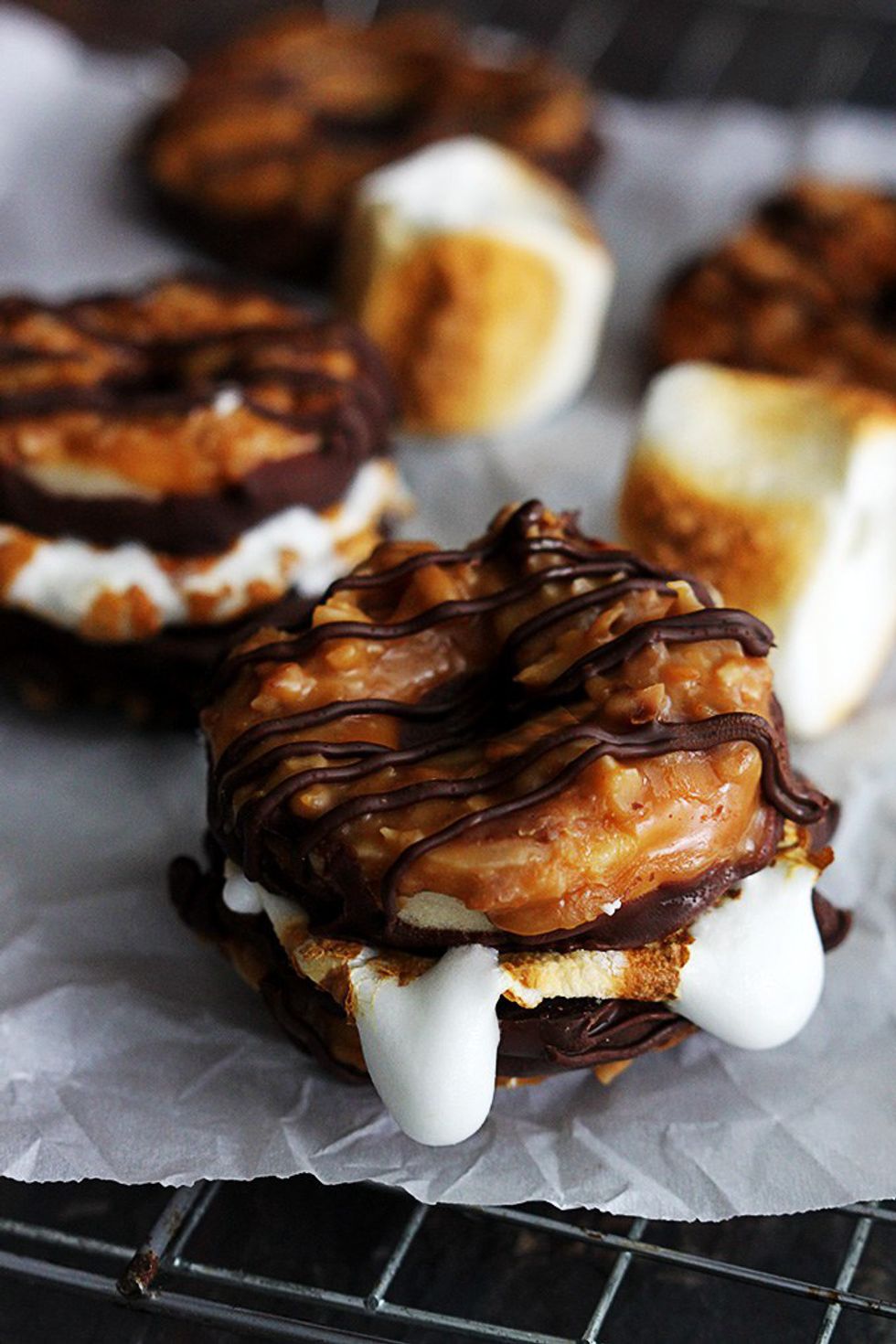 Toast a marshmallow and smash it between two samoas for this delicious treat! Find the recipe here (includes a link to a homemade samoa recipe in case you've eaten all of yours already!)