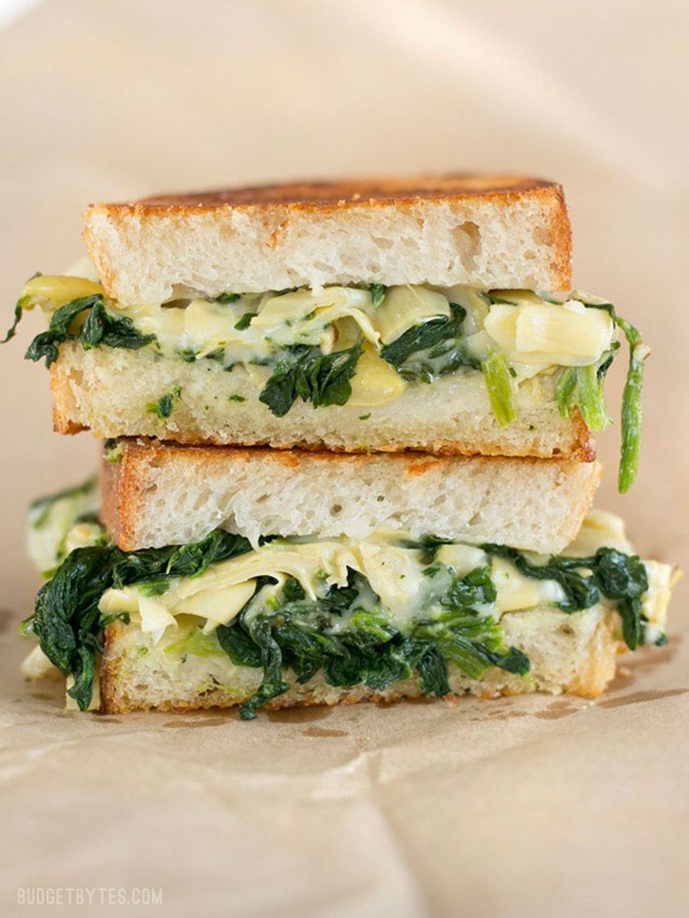 This is spinach artichoke dip transformed into a sandwich. This one has to be good because there are vegetables! Oh yeah, and a little over a cup of cheese.http://www.budgetbytes.com/2016/07/spinach-articho...