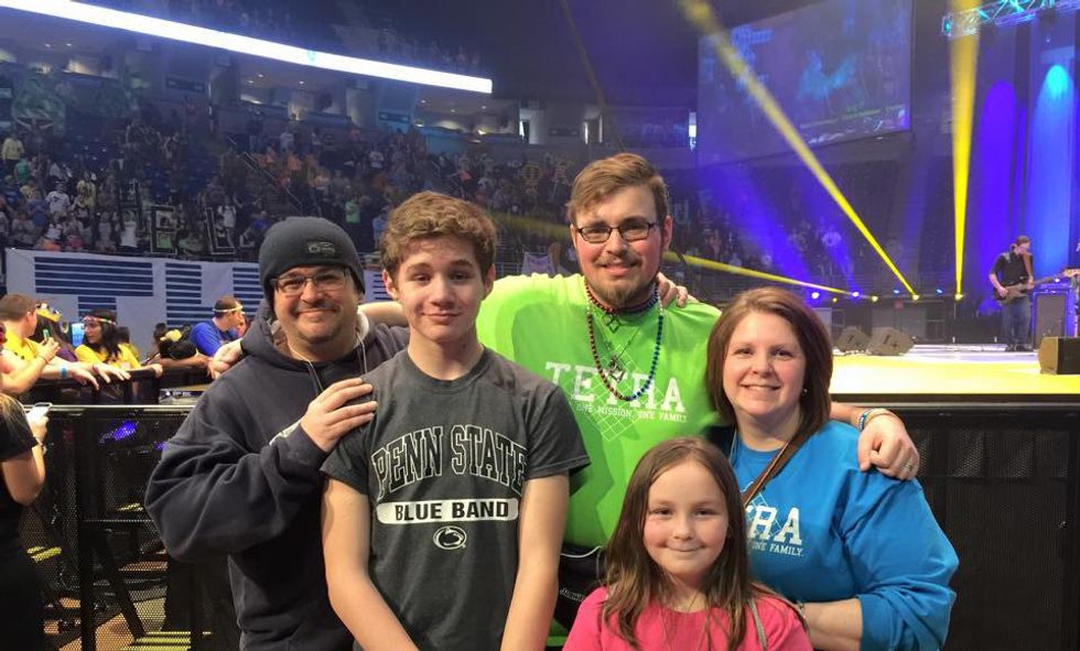 Orgs in THON are often assigned a Four Diamonds family - a family with a child who either fought or is currently fighting cancer. Our family, whom I still keep close contact with, was the Otstotts. Bob (in the white PSU hat), Shannon (right of Bob), and Dani (right of Shannon) are the family of Ashley, who as of October, 2016, has been cancer-free for twelve years! Ashley, like a lot of Four Diamonds kids, knows just about everyone at THON, so I'm sure she's chatting with someone just outside the frame of this picture!