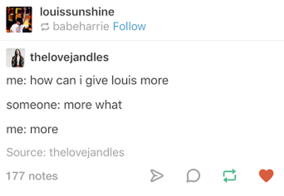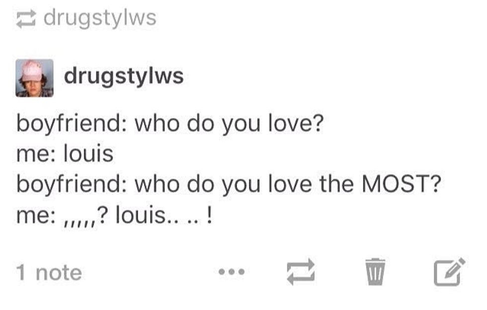 Disclaimer: most of these are Larry Stylinson related. Because, let's face it, the Larries are the funniest and most entertaining people in this fandom. Also, we make up most of the fandom so this whole thing is just inevitable, isn't it? Oh, and almost all of them involve Louis. Because I am a proud Louie and I love him a lot, a lot, a lot.