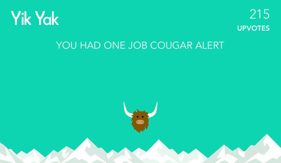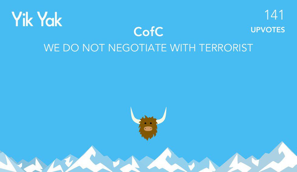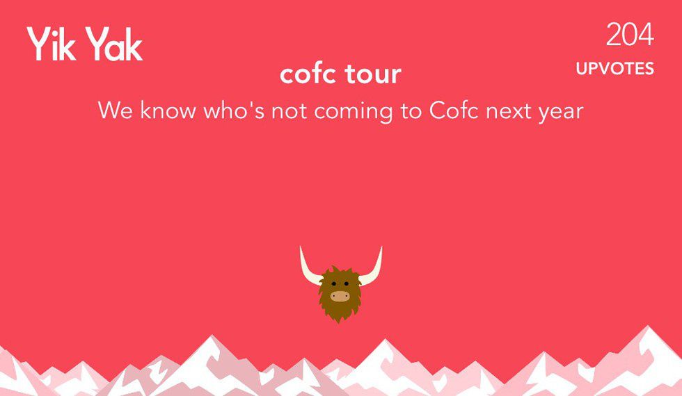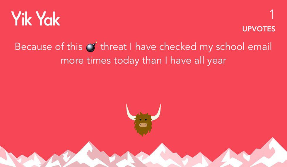When there is trouble on campus, college students everywhere turn to Yik Yak for answers. College of Charleston students, when posed with a possible bomb threat on the morning of February 10th, were no different. Forget safety, you just thought of something clever and snarky to yak. When there is mass pandemonium and Cougar Alert is sending you more mixed messages than a flirty text from your ex, Yik Yak proves, once again, to be a reliable source of fast (and funny) information.
