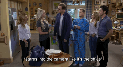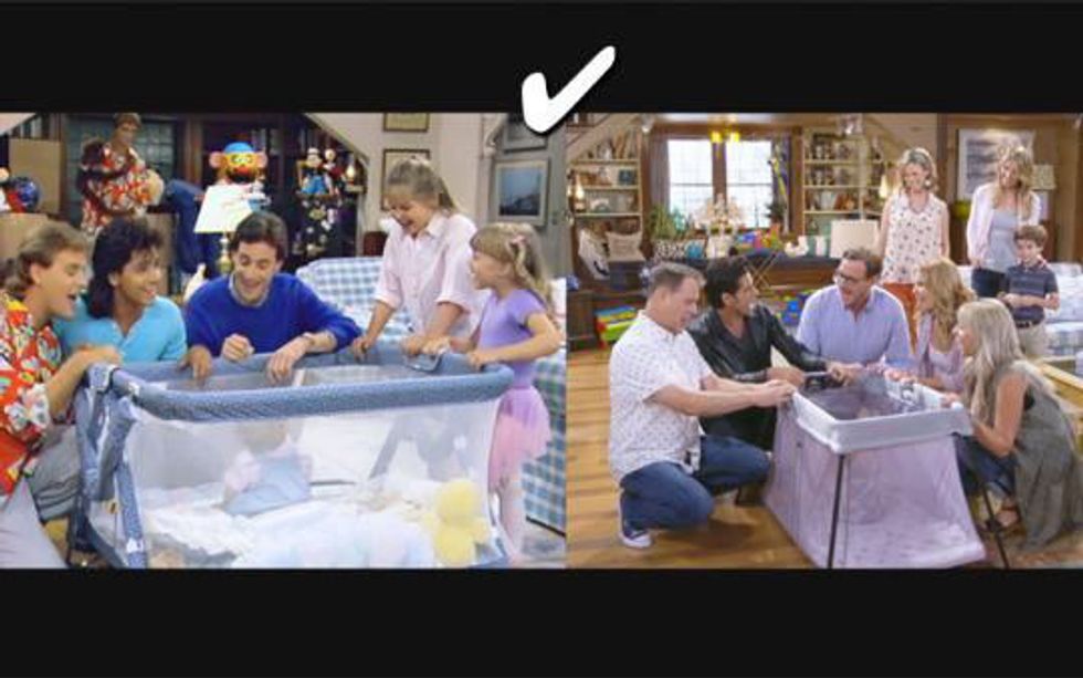 This is probably the most sentimental moment in the entire episode. When DJ's baby, Tommy, starts crying, the whole family jumps to action and begins singing the Flintstone's theme song, just like they did when Michelle was a baby. This scene is extremely touching because they play the new scene side-by-side with the original. This shows fans that even though a lot has changed, some things still remain the same.But, what's missing? Michelle's catch phrase "you got it dude" is nowhere to be found because Mary-Kate and Ashley Olsen declined the offer to come back for the show. In the first episode, when Stephanie asks where her little sister is, Danny Tanner explains that Michelle is "busy in New York running her fashion empire". But, shout-out to the cast for breaking the fourth wall and taking a solid 30 seconds to give the camera a disapproving look. No offense, Olsen twins, but I think you deserved that.