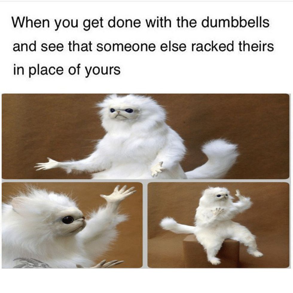 People who do this at the gym, please don't do this anymore, I beg you. How would you feel if someone took you out of your house, shook you around with sweaty palms, then did not care enough to put you back into your house. It's irritating. Maybe just as annoying as the problem in the next meme.