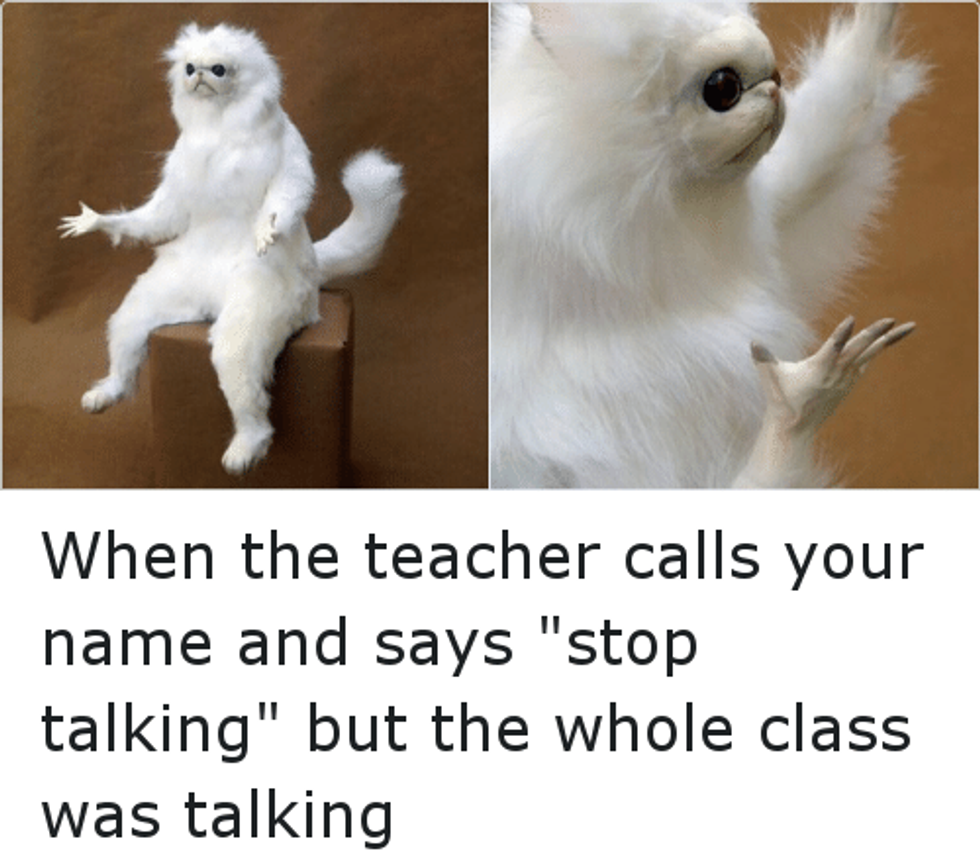 I used to talk quite a bit with my friends Jaytee and Christian. We would talk (more like I would talk) and the teacher would call me out on it. I remember thinking the same thing as this meme, but I probably was the loudest talking person in the room. I eventually learned I have trouble whispering.
