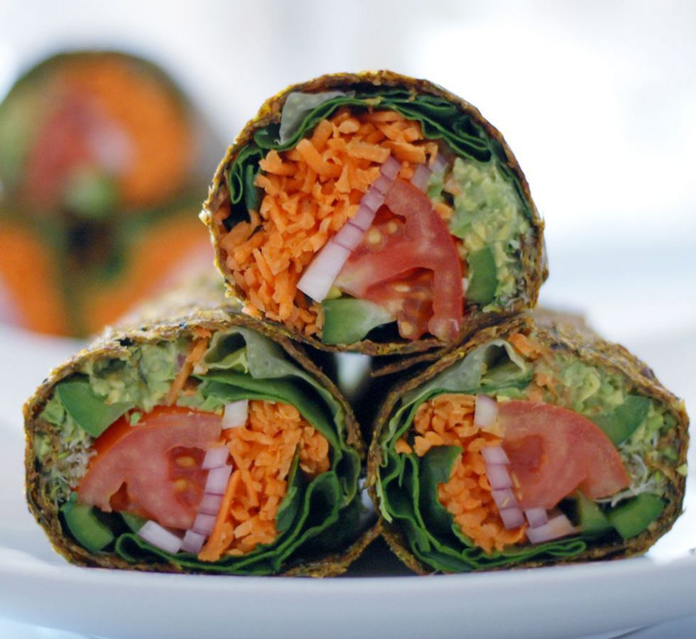 Just like salads, wraps are awesome because you can make them however you like. I find that I have to use large tortillas made for burritos because I like to pack them full of good stuff, and the other wraps don’t seem to hold up. My favorite wrap combination that you can try includes avocado, lettuce, tomato, shredded cheese, salsa, and chickpeas.