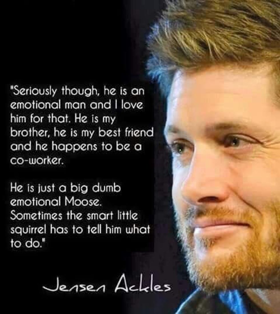 Jensen Ackles and Jared Padalecki play demon hunting brothers on the hit show, “Supernatural.” Dean Winchester (played by Ackles) and Sam Winchester (played by Padalecki) take on the “family business” that was practically forced on them at a young age. After many, MANY years of hunting “supernatural” beings, the main characters, Jared and Jensen formed a bond - a brotherly bonding - and became friendship goals.