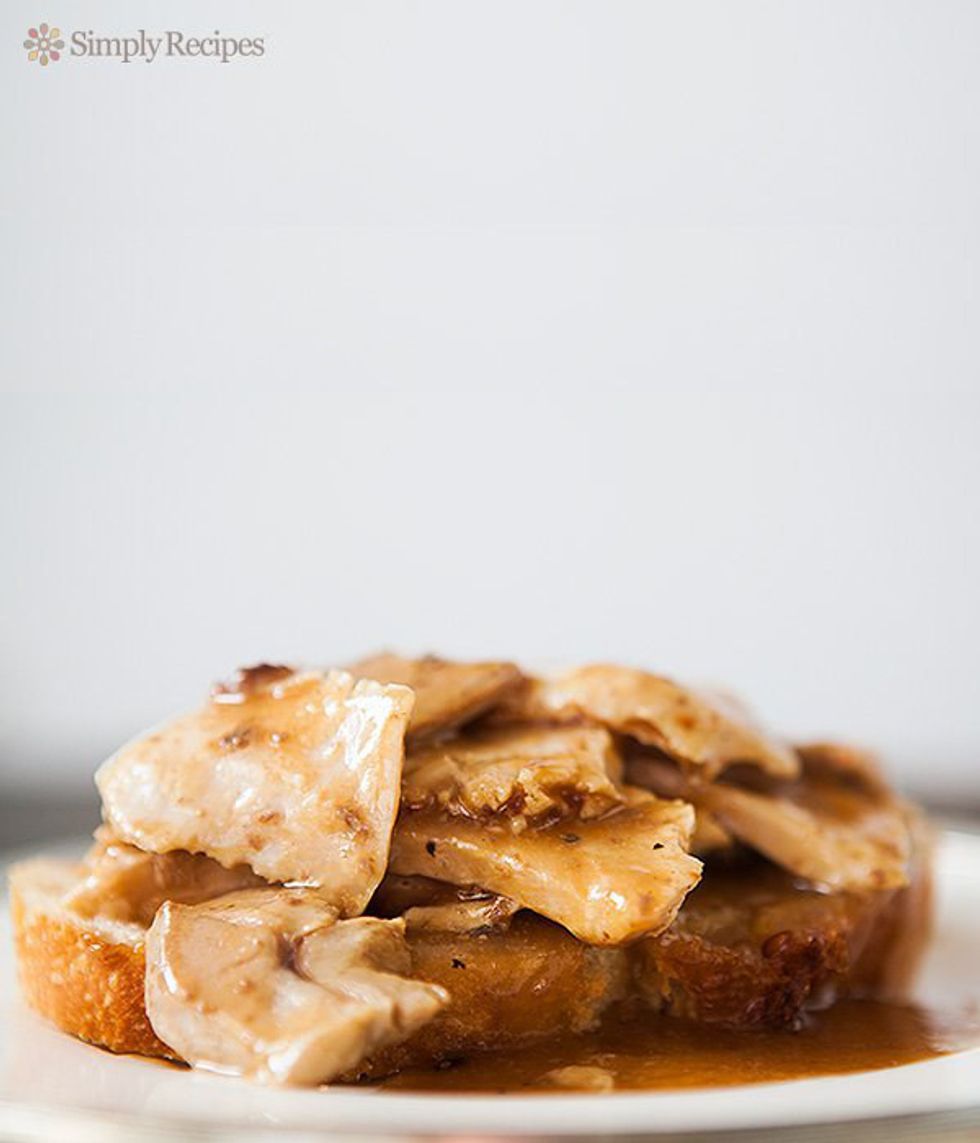 Heat the gravy in a skillet until it becomes bubbly. If it is too thick, add stock or water. Add the turkey to the gravy, and heat until all sides are covered and marinated. Then add the turkey and gravy to the bread. Boom!