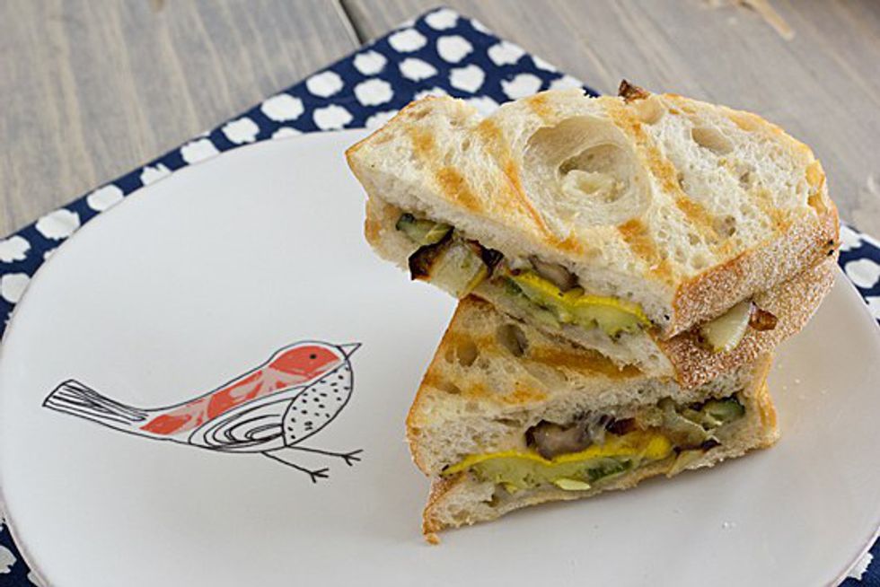 If you have a panini grill, heat it to medium-high and top your bread with cheese and veggies. If not, place cheese on bread and place hot veggies on top. Serve.