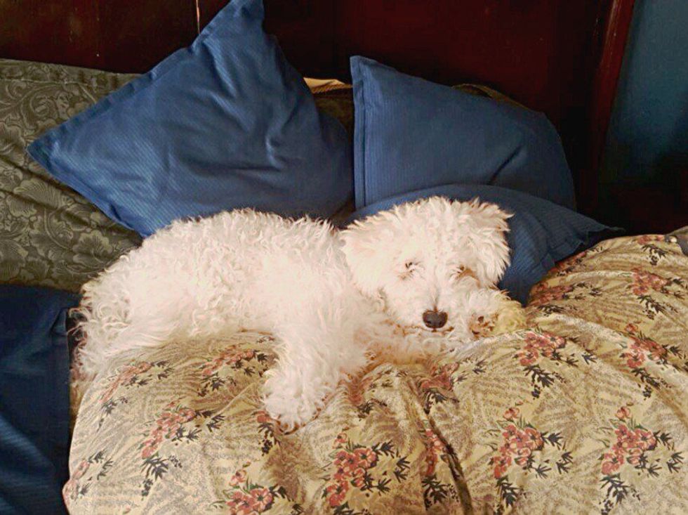 As I'm writing this, I can picture you snuggling under the sofa with the Tinker Bell blanket my sister gave up for you. I can imagine your tiny white curls and how many knots you must have since I left you five weeks ago. I can see you jumping all around the house, bugging everyone to play with you with that little rope toy my mom got for you.