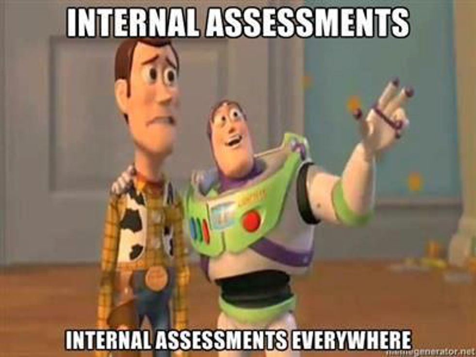 At least IB is up front with you about the impending death sentence mentioned above, but internal assessments (IA's) seem to take all IB students by surprise. IA's are essentially ways of telling how well-versed a student is in each subject area. Going back to introductory IB talks, I did hear IA's mentioned, but it was quickly mentioned, and not talked about in detail. Many times, IA's involve oral interviews, written critiques and a whole lot of other tests depending on the subject; they are almost never one test, but usually consist of two or three parts. As if things seemed overwhelming before, enter the internal assessments! But we all plowed through them, nonetheless.