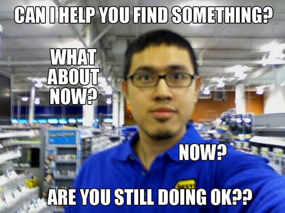 Okay, I know you said you are "just looking," but like are you sure you don't need anything? I’m sorry, I know you don’t want to talk to me, but my manager is watching so I’m going to ask you if you need any help for the hundredth time. I totally know you can get this size by yourself, but please let me get it for you so my manager thinks I’m doing something.