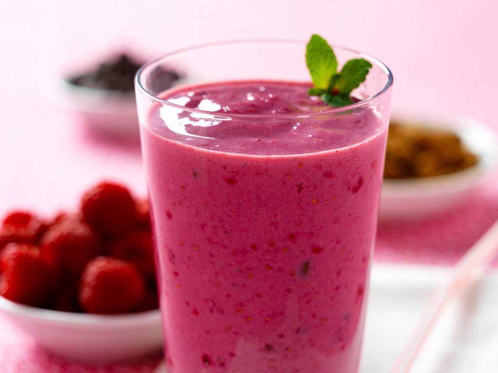 Ingredients: One-fourth cup of milk, one-half of medium ripe banana, one tablespoon of creamy peanut butter, one cup of fresh or frozen raspberries, one-half cup of crushed ice.