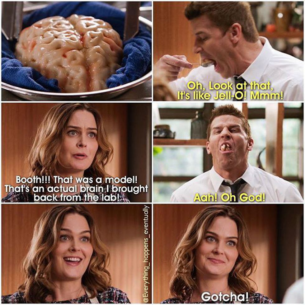 Murder isn't always the funniest topic, but the writers of "Bones" always made sure we had something to giggle at, whether it be an experiment gone wrong, Aubrey's food addiction, Caroline's antics, Bones's random facts, or Booth's funny socks.