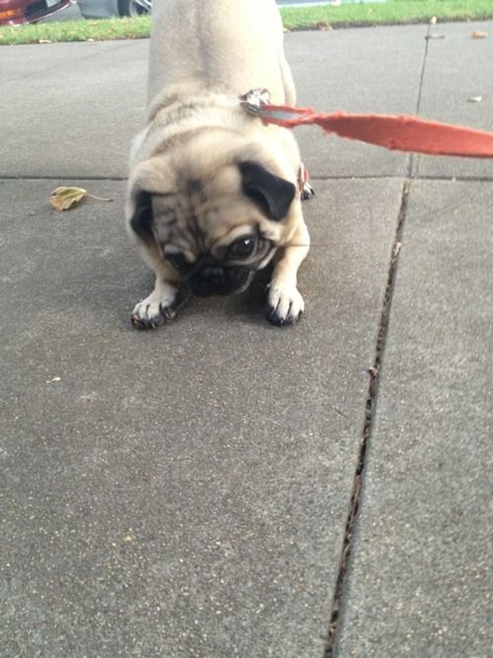 Though they be but little, they are fierce. Pugs don't care for the word "no," and often flat-out refuse to hear it. Prepare for a lot of leash-tugging, and even the occasional cold shoulder when the walk ends a little sooner than someone would have liked.