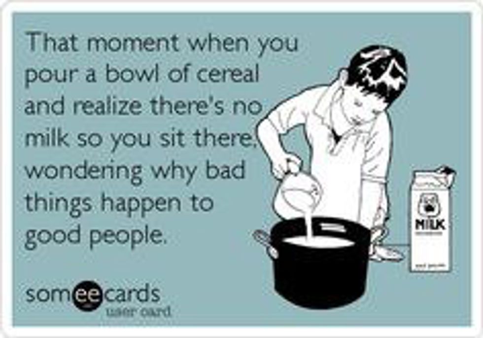 Food is a big deal in a big family. It disappears within a 24-hour span- especially if it's good. If mom buys "good cereal", you eat it in record timing. You don't even have to be hungry, you'll eat it anyway because you know it'll be gone by the time the sun rises. Either that, or there will be no milk left to eat it with. And there's this weird thing with milk. It's like every time you crave cereal, there's no milk. Even if you never eat breakfast, but decide one morning you will and wake up excited to eat a bowl of cereal, there's no milk- or there's a tablespoon left in the carton. Which leads me to..