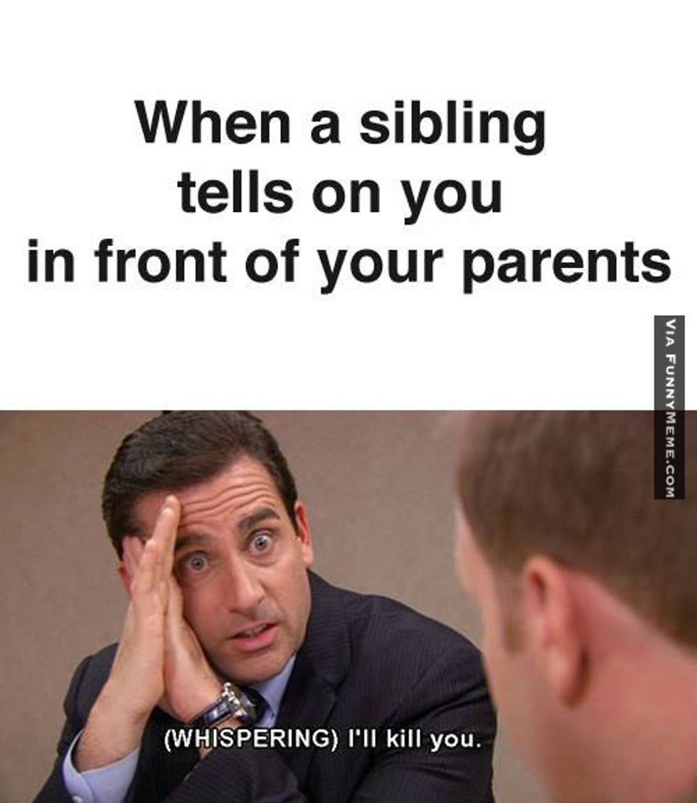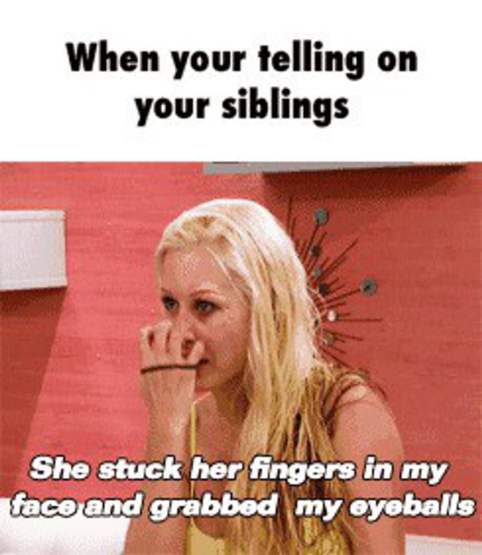 You love to get your siblings in trouble. You have this evil look on your face as you're doing it too. You always have something to prove to your siblings, always. And the more detail you share, the more trouble they get in. So here it goes, "mom, I'll tell you exactly what happened."