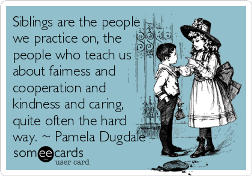 You’re weird, creepy, loving, funny and generous, but also selfish and harsh towards one another all within a 24-hour span. It's constantly up and down. Sometimes they are your rival and competition, other times they're your partner in crime and helping sneak you out of the house in the middle of the night. One minute you love them, the next you hate them. Two minutes later, you love them again. You have a hard time deciding whether or not you want to hug them or hit them. It's so much harder to be nice than it is to be a smart-ass, so you usually take the easy way out. They get on your nerves and push your buttons, but at the same time you need them. That's just how it works.