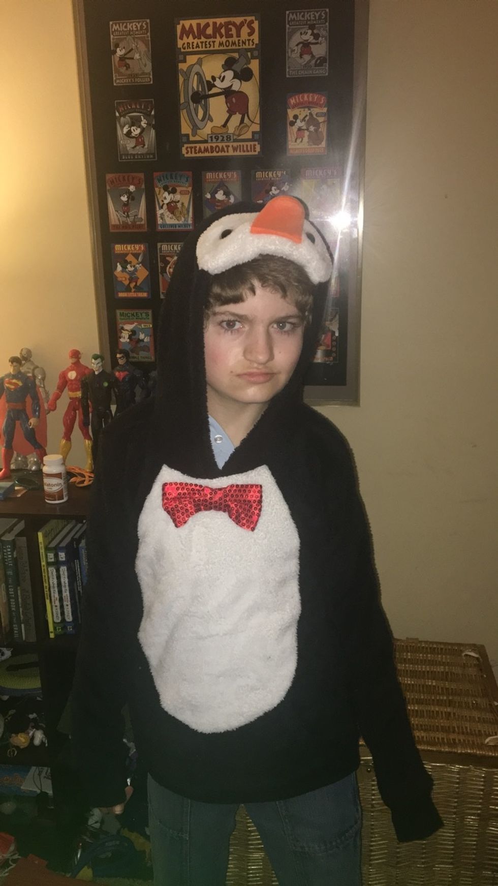 This is my brother dressed as a penguin for Christmas last year. He looks angry because he's awake at 7am, but he's also dressed as a penguin so it doesn't quite have much of an effect.