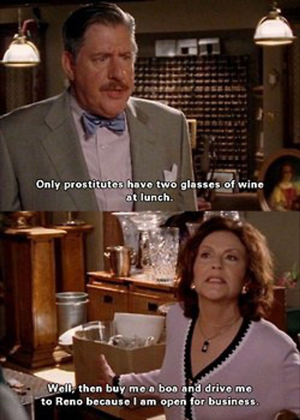 When Richard and Emily are on the verge of separation, they have a blowout that leads to the above exchange, followed by Emily escaping out the window. In this escape, she manages to lose her skirt and has a confrontation with the cops in the driveway.