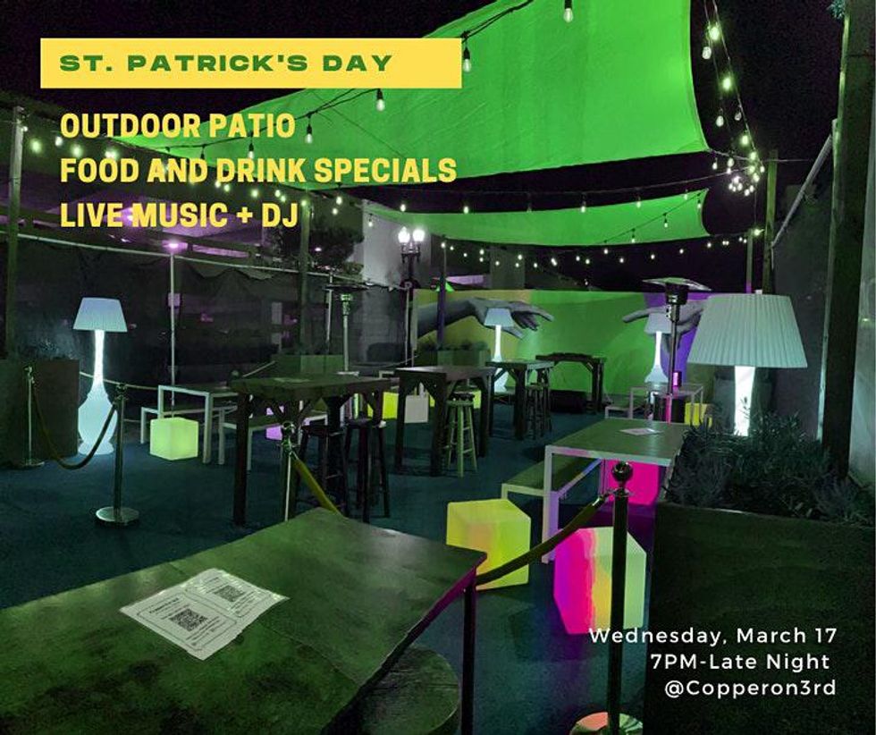 Stop by 'The Copper Door' for a St. Patrick's Day celebration. It is a below-ground bar with food and drinks specials, a freestanding fireplace, and live Irish music. The event will be located on the 3rd outdoor patio. Bar has a limited capacity.
