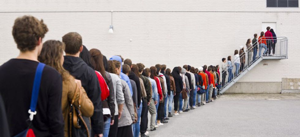 Example: I wanted to grab a Starbucks before class, but the queue was too long, OR people are already queuing up for the football game, go Dukes!
