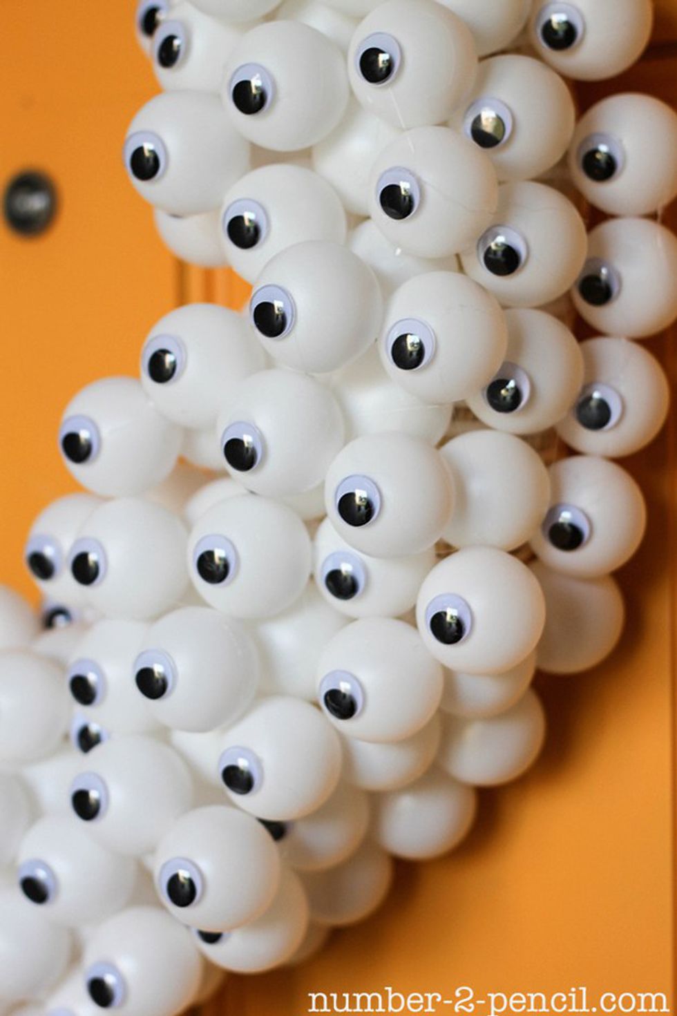 Lacking money this season? No problem - here are some easy, DIY decoration that will spook your neighborhood. You can make a googly-eye ping-pong ball wreath, milk-jug Halloween lanterns, simple spider and bat decor, and glow-in-the-dark spooky eyes!