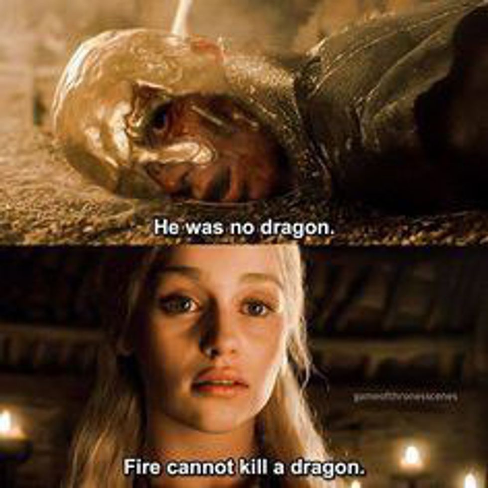 Why it's feminist: The rapid sequence of events is this: Daenerys begged the witch to save Drogo's life, a promise that was fulfilled, but Drogo is a mere shell of the man he was. His body lives, but his spirit is gone. Realizing this, Daenerys smothers him with a pillow out of mercy and gives him a proper funeral. She burns the witch along with him and walks into the flames herself. At the end of the episode, she rises from the still-smoking pyre covered in ash, but otherwise unharmed, with three newly hatched dragons crawling upon her. She says nothing as the others bow down in awe.