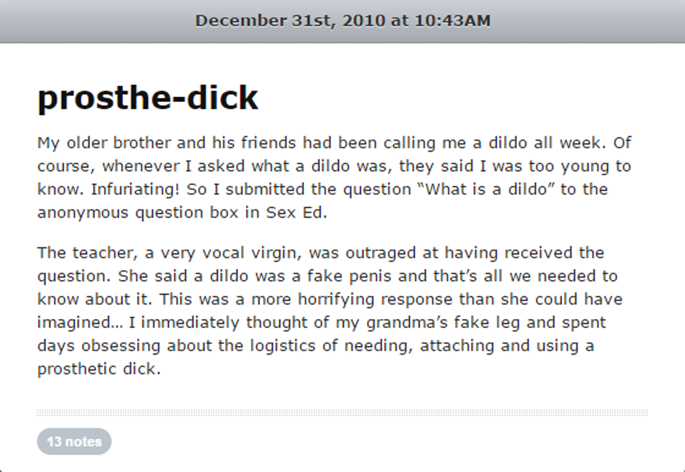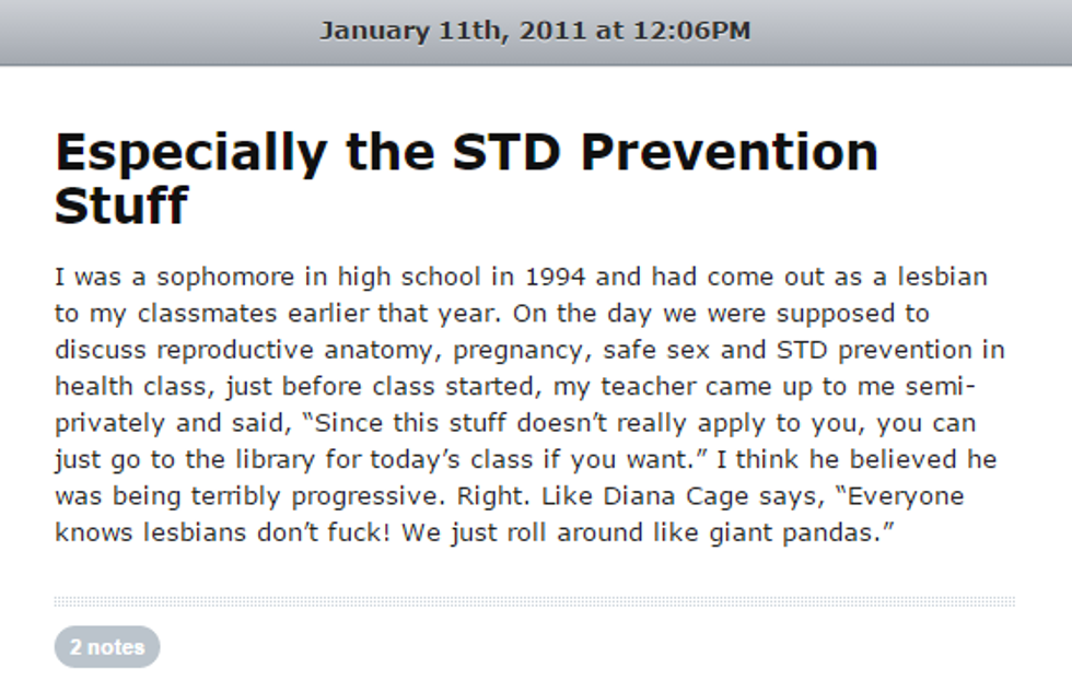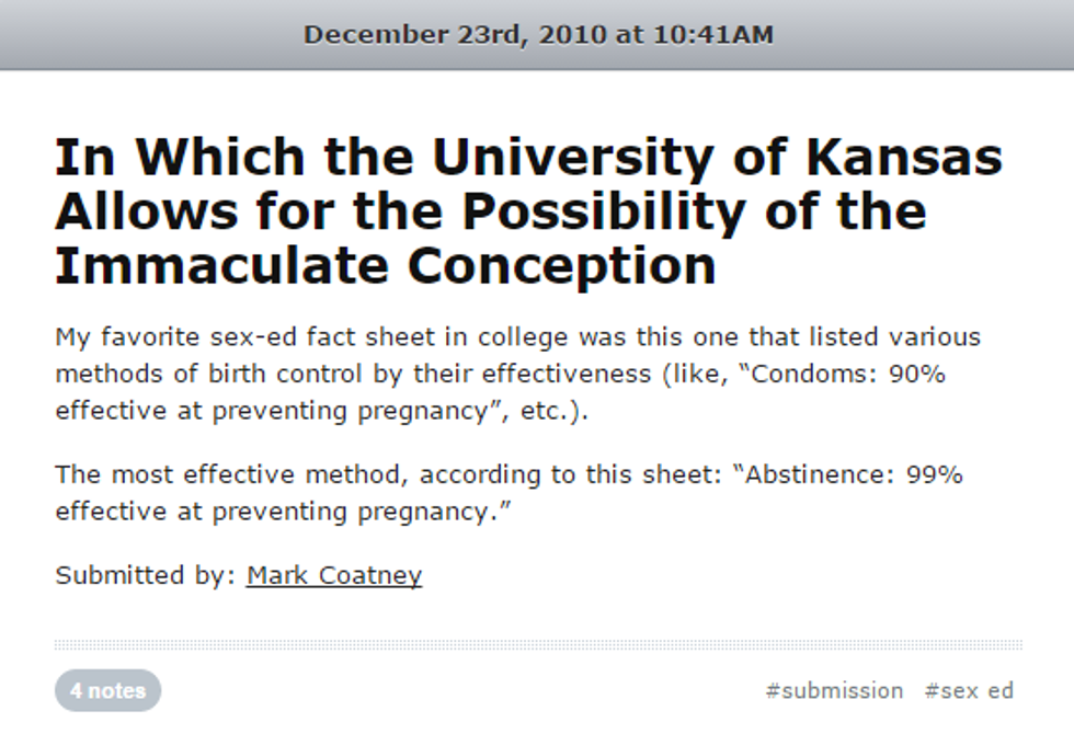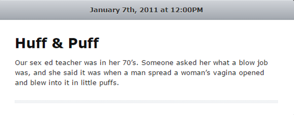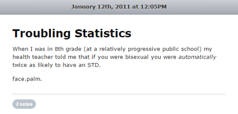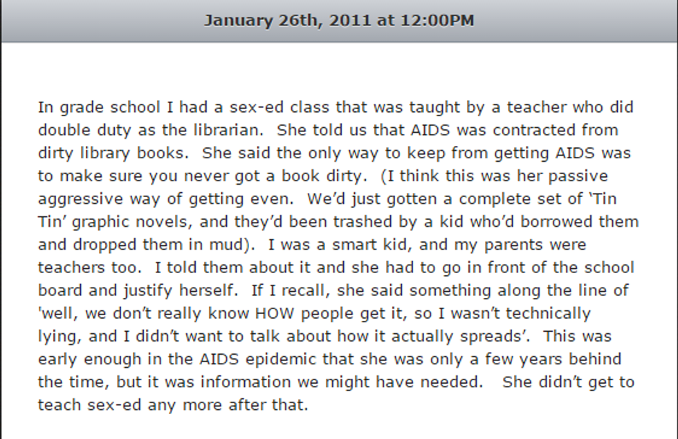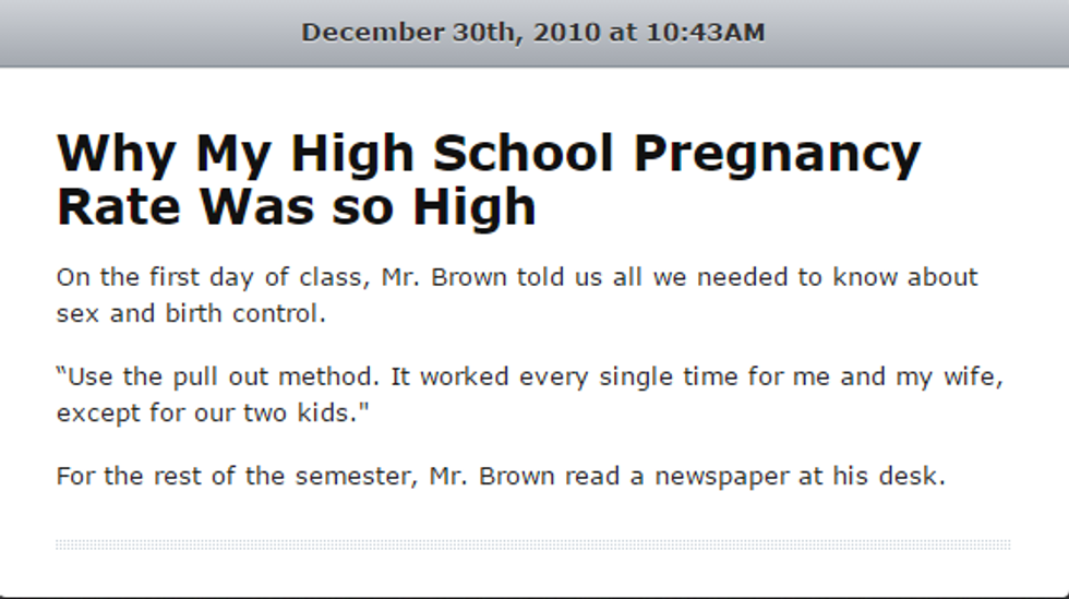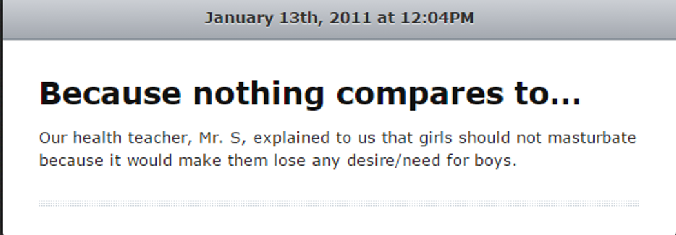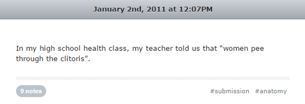 It's a pretty well-known fact that our sex education system in America is failing. While some states like Colorado are making strides to prevent teen pregnancy, the United States as a whole is still painfully behind. In a recent video, John Oliver pointed out that "only 22 states mandate sex education, and only 13 require the information to be 'medically accurate.'" That being said, here's some of the worst of the worst from badsexed.tumblr.com .