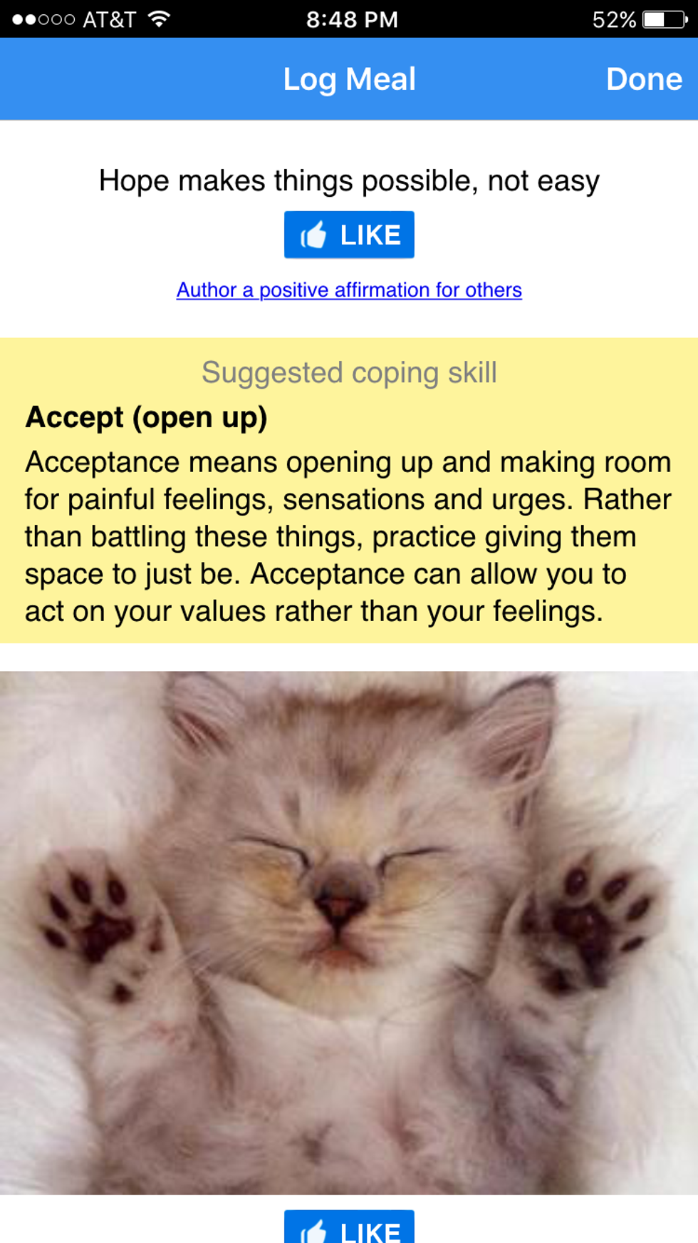 Recovery Record is an app specifically for those struggling with an eating disorder. While the app does have you log every meal, it doesn’t track any nutritional value at all. Instead, the app focuses on how your meal made you feel and if you experienced any signs of an eating disorder. After completing your log, the app takes you to a page with words of encouragement, a coping skill suggestion, along with an inspiring quote or a photo of an adorable animal.