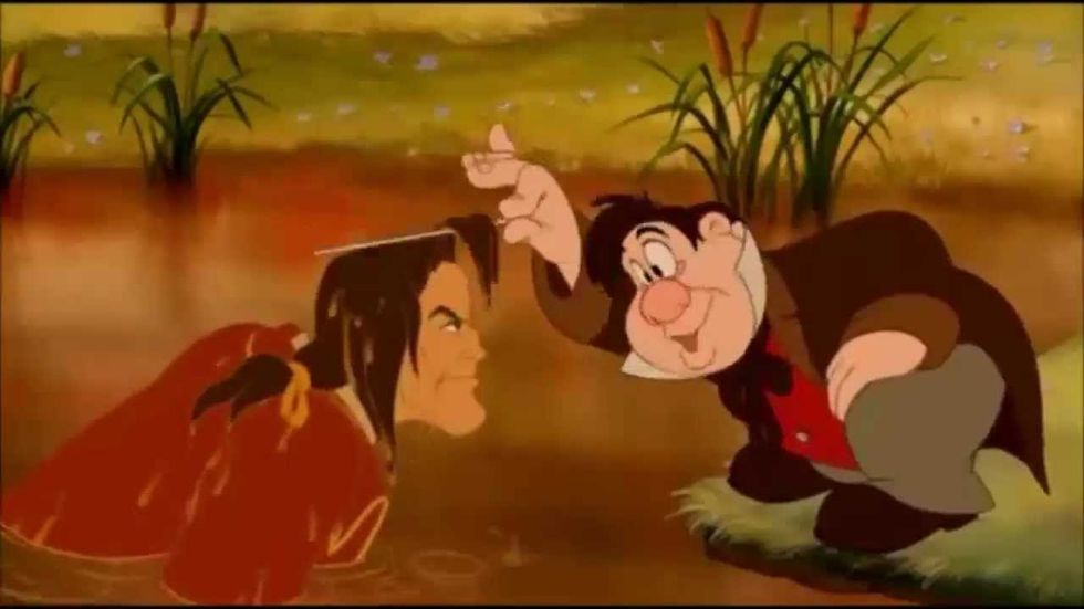4. When Belle kicks Gaston out of her house, he immediately falls into a pile of mud that is not there in any other scene.