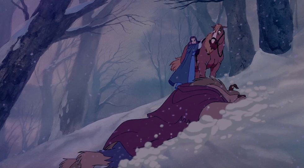 7. When Beast saves Belle from the wolves, Beast becomes unconscious. This means that Belle must have somehow lifted Beast onto her horse by herself.