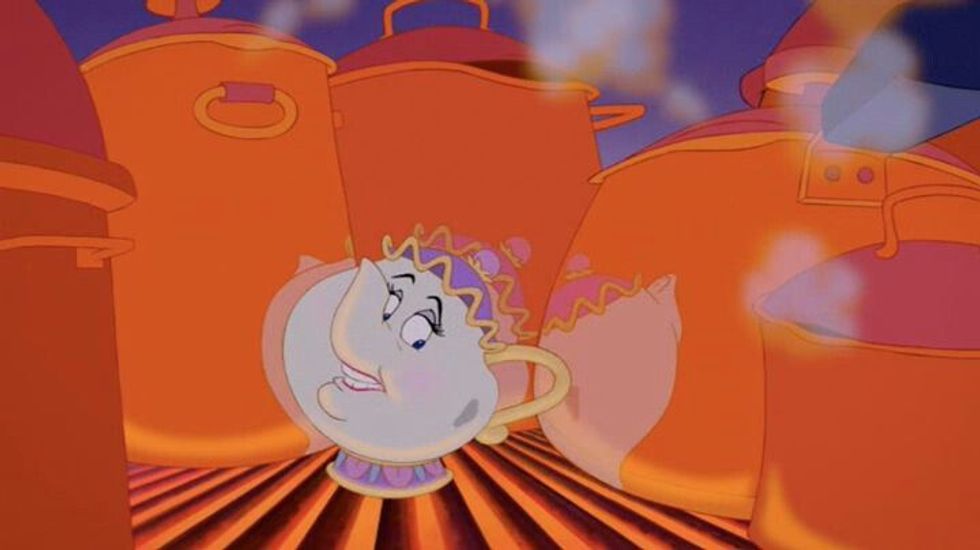 10. Mrs. Potts complains about having a spot on her, yet she does not have a spot in any of the scenes leading up to that scene.