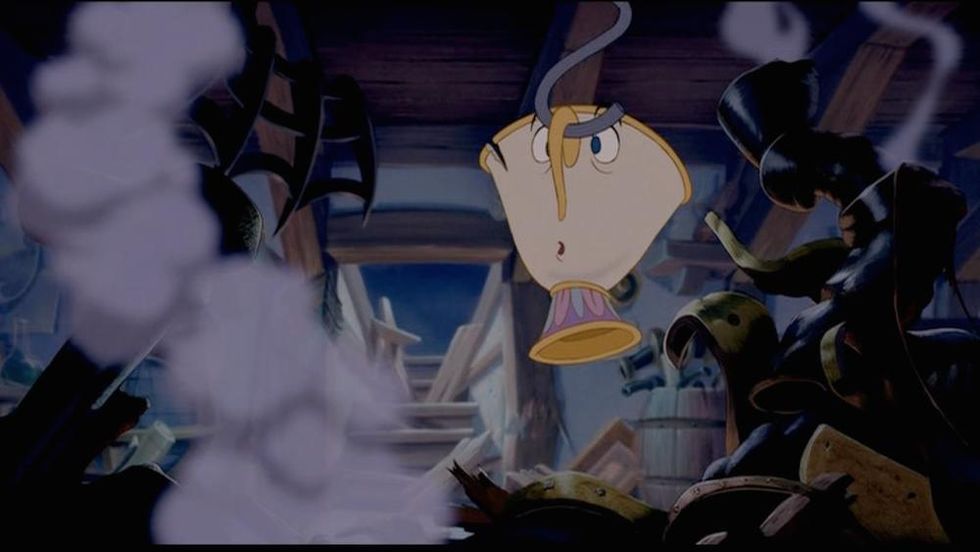 11. Chip, a tea cup with no arms, is able to get the chopping machine that Maurice invented working. He even managed to steer it right into where Maurice and Belle were trapped.