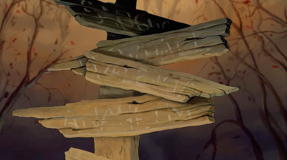 13. Maurice chooses to go down the dark, scary path even though his horse obviously does not want to go.