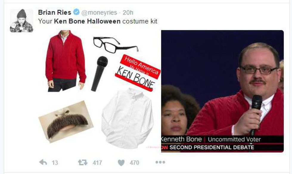 Everyone's favorite debate audience member. Ken Bone stole our hearts in his back-up outfit, after his suit ripped the night of the debate. What did he ask about again? Energy and the economy or something?