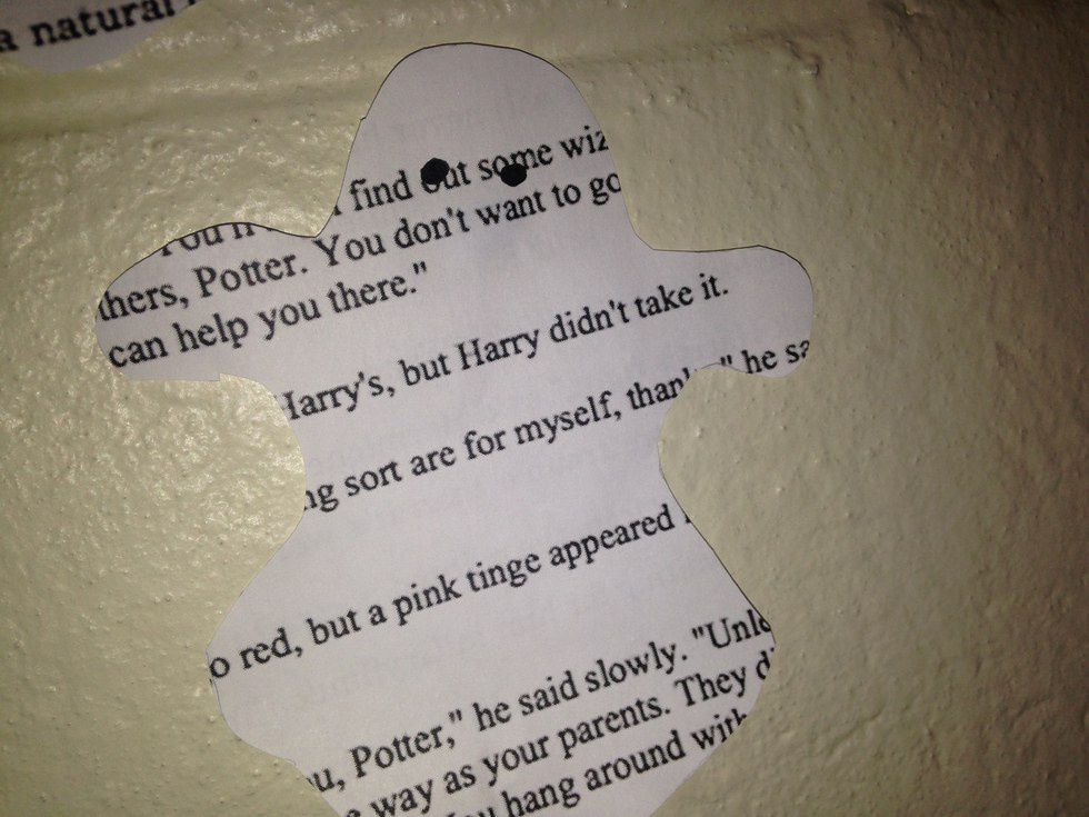 In order to make your “Ghostly Reader,” you can either use a page from a book you already own, or print a page you find online! First, trace a ghost shape onto your book page, then cut out your ghost and add a face with a black marker! Hang up your ghost on the wall next to your bookshelf for some Halloween and reading fun.