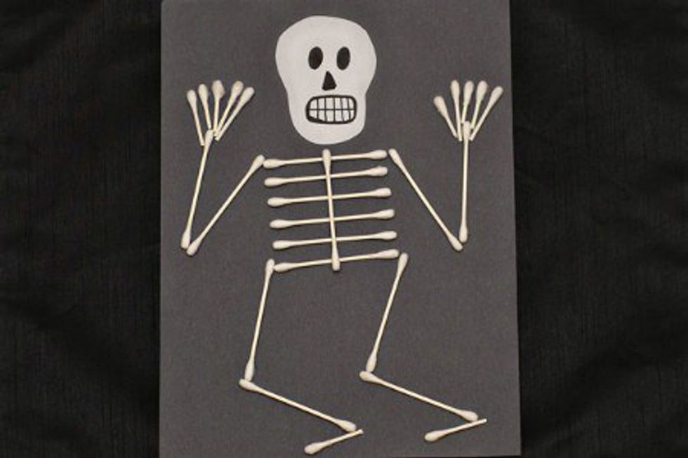 To make your skeleton you will need, black and white paper, and Q-tips. Start by drawing your skeleton’s head on the white paper and glue it to the black paper. Then, use your Q-tips to give the skeleton its body! All of these items are at home, not store trip needed!