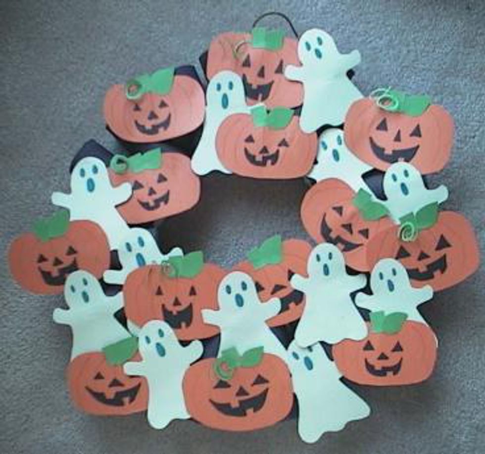 For a wreath to hang indoors or outdoors, buy a dark wood wreath and other small Halloween decoration that you can hot glue to the wreath. For a more DIY kind of wreath, use orange and white construction paper and cut out pumpkin and ghost shapes into a circle, glue them together and glue string on the top to hang it anywhere!