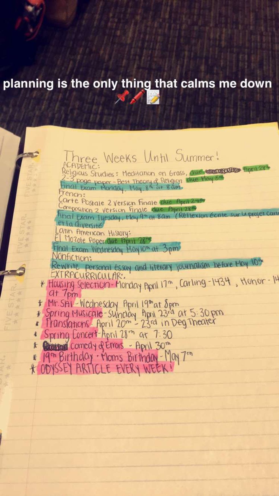 You now know every assignment you'll have to complete, and when you'll have to complete it from now until finals week. BLESS!