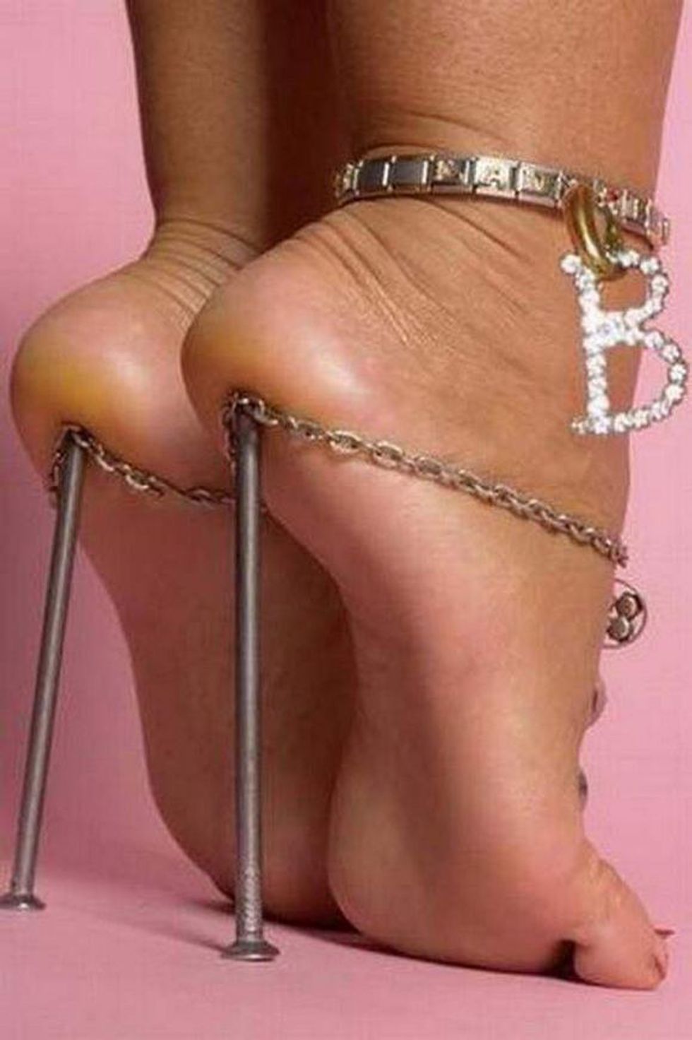 I'm wincing just looking at this girl's feet. I think those might be actual nails she's balancing her weight on. Why? Why would you do this?