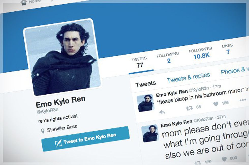Kylo Ren's first tweet was on Dec. 21, and he already has over 770,000 followers. That's pretty impressive, especially since he only tweets about Darth Vader and Hot Topic.