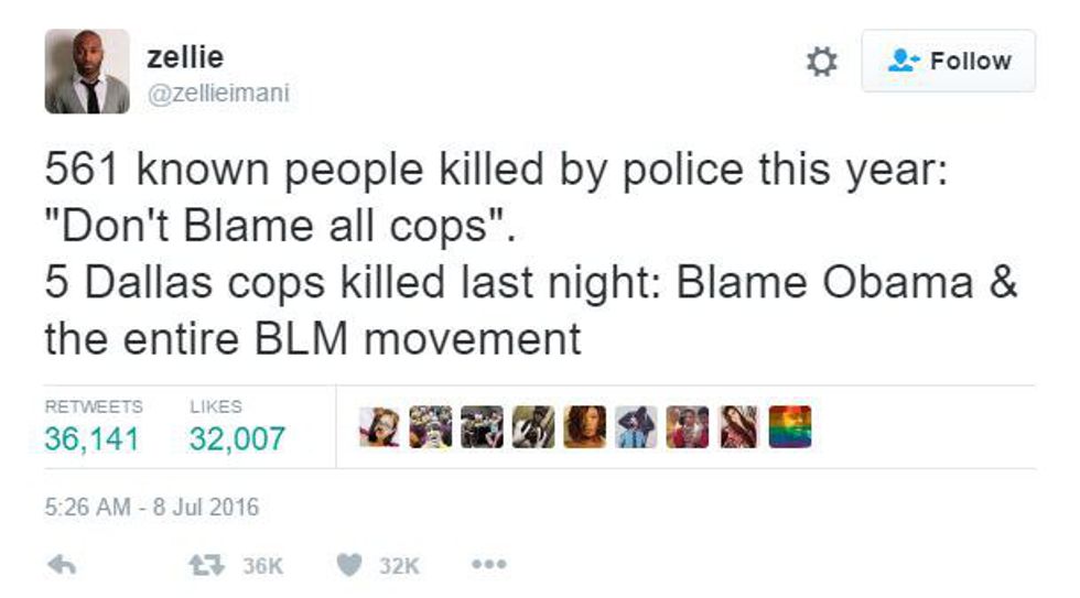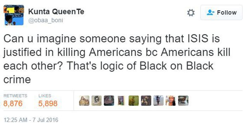 Americans react immediately to even a hint of a terrorist attack but fail to acknowledge terrorism as something not only carried out by non-Americans. The black-on-black crime excuse is only reasonable if you agree cops should be compared to criminals.