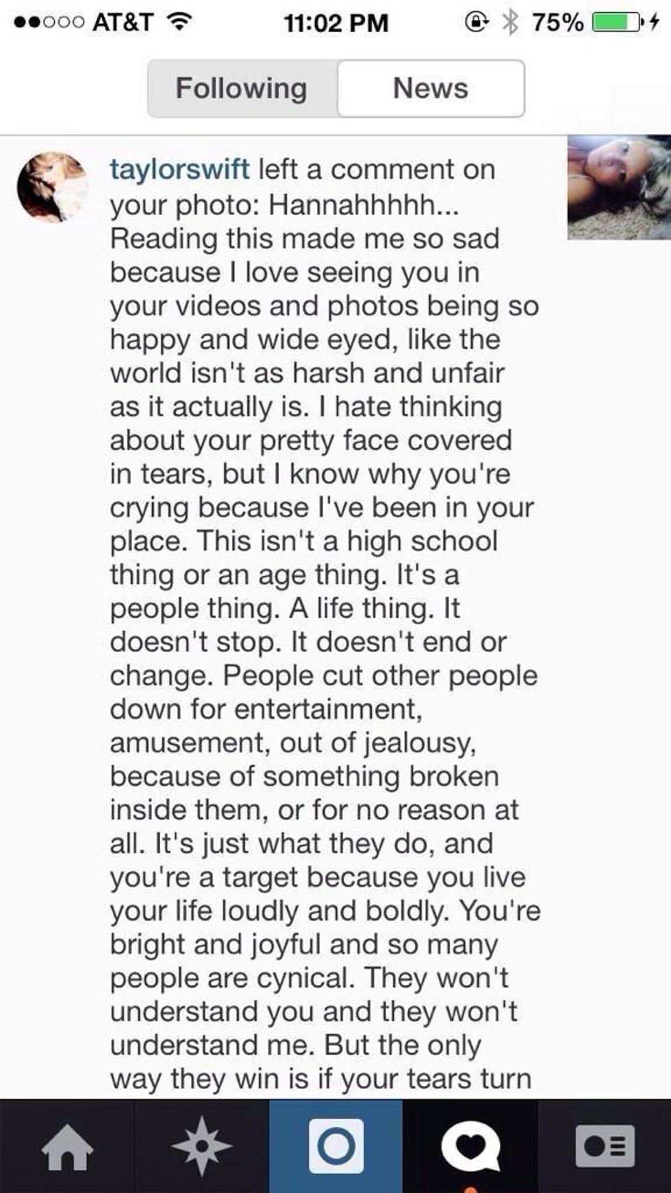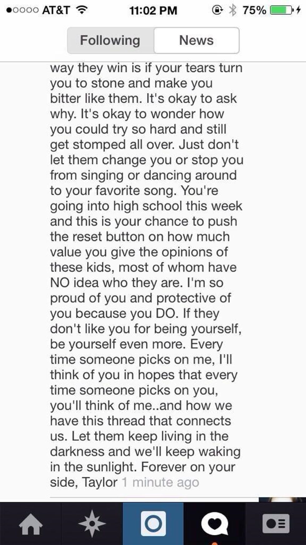 " Reading this made me so sad because I love seeing you in your videos and photos being so happy and wide eyed, like the world isn't as harsh and unfair as it actually is. I hate thinking about your pretty face covered in tears, but I know why you're crying because I've been in your place. This isn't a high school thing or an age thing. It's a people thing. A life thing. It doesn't stop. It doesn't end or change. People cut other people down for entertainment, amusement, out of jealousy, because of something broken inside them, or for no reason at all. Let them keep living in the darkness and we'll keep waking in the sunlight. Forever on your side, Taylor."