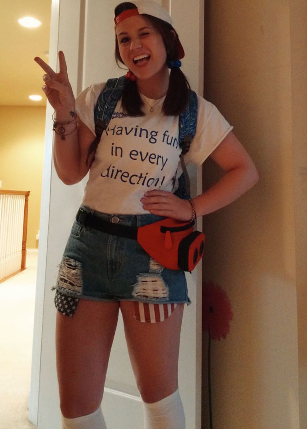 Crocs, fanny pack, ponytail, and a tie-dyed shirt